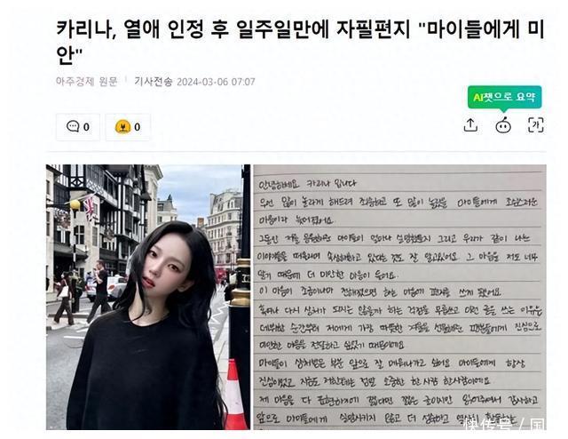 3月6日,有韩国媒体报谈,与演员李宰旭恋爱的,韩国闻名女星aespa成员柳智敏,在一封手写信中,向粉丝们抒发了歉意。 5日,aespa柳智敏在她的Instagram上发布了一封长长的手写信。柳智敏承认与演员李在旭的恋情后,在手写信中直露了我方的真是感受,此时距离她与演员李在旭公布恋情已历程去了8天。